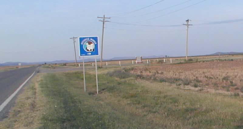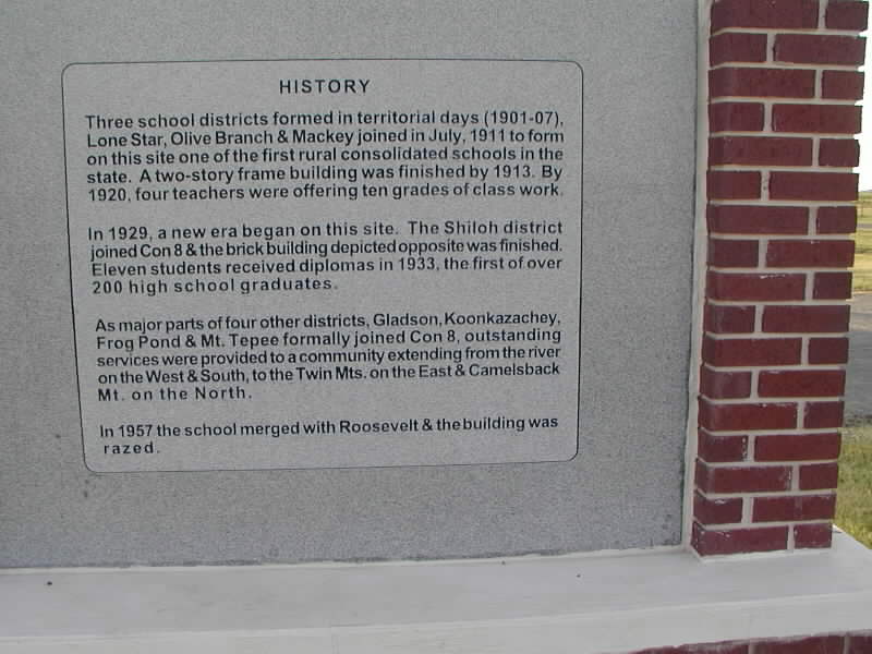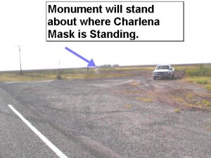 This monument is on a one acre site at the old con. 8 school corner,  something like 9 miles southeast of Roosevelt along Highway 19. The road bends from south to west just one mile east of the site. A curved road passing near the monument connects the highway to the county road going south which forms the western boundary of the plot. The road easily accommodates a number of cars, but is designed to discourage parking of a large semitrailer.