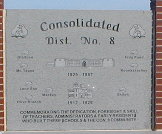 And there was a wide and enthusiastic support. The generous contributions of money by friends and alumni, and of the land for a site by Mr. and Mrs. Eric Jackson during the next nine months, allowed planning to proceed. Many have contributed their time as well as money, but Charlena (Dempsey) Mask and Willie Jackson, Co-Chairs of the Memorial Committee and also living next door to the site, have dealt with most of the work of coordination and supervision that had to be done. It was a lot. The preliminary design ideas for the site and the marker were assembled by the committee during the next nine months and for the monument were submitted for bids in the early summer of 2000. The overall contract for the marker stone and auxiliary structure were was made with Heritage Granite of Altus (Lori Ray Hawkins head and designer). At the same time and preliminary grading of the site was done by the County, before the end of August 2000, when this picture was taken.