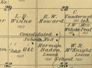 Several features of ordinary life are visible. Just to the left of Herman’s elbow is what magnification indicates is a one-horse light wagon or surrey. The to the right is one of the school privies. Just behind it is the fence at the east boundary of the school grounds. In the distance can be seen two home places.