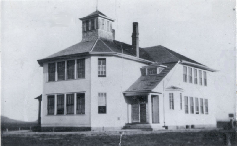 1917 Front View of Con 8 A copy of this was in an old family album preserved by Rex McClure. This view reveals clearly the basic tee shape, the rear forming the top of the T, the two entrances approached by symmetrical east and west porticos; and the concrete walk some of which was completed in 1914-1915. Both the east and west goals of an outdoor basketball court are visible at lower left.