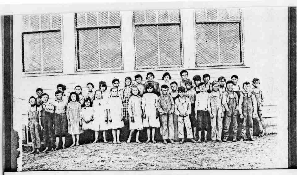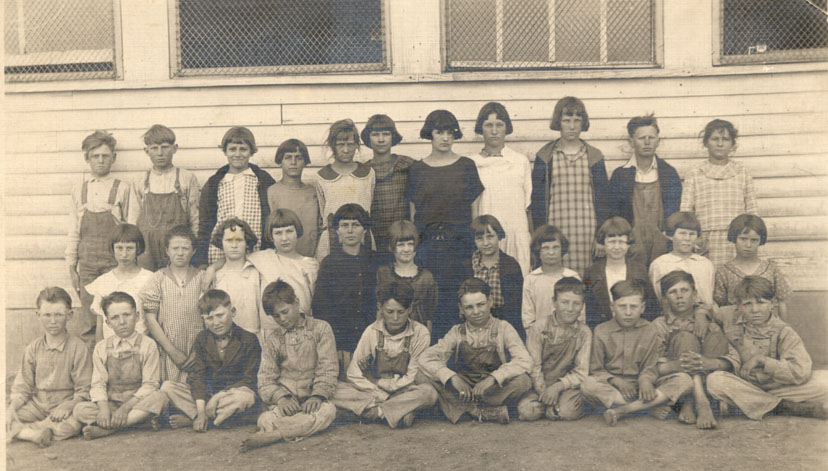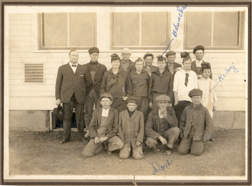 1923-1924 4th?, 5th, 6th Grades Ruby (Burton) Heien, Teacher, standing 7th from the left. Back at the favorite southwest corner. Now the ground slope is just left of the center of the picture. Part of the fifth window from the south shows and the basement window under it is only partially obscured by the leftmost student.