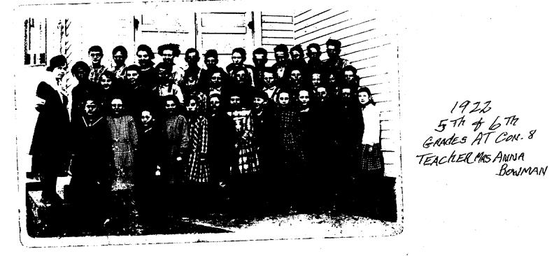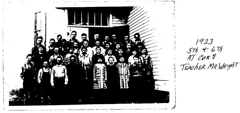 We have two good pictures of the building and three of classes in front of it (est. dates of 1913, 1917 and 1924). Also, three Xerox black and white copies of pictures dated 1922, 1923 and 1924. If anyone has more pictorial evidence, I would like to make arrangements for obtaining copies of the archives and perhaps eventual inclusion in a publication. Elizabeth Heien (Class of 52) provided me an opportunity to copy two of her mother’s pictures showing Ruby Heien’s 1917 8’th grade class, and a class that she was teaching at Con. 8 in 1923-1924. The pictures available relating to the building with additional comments can be viewed in the following link.