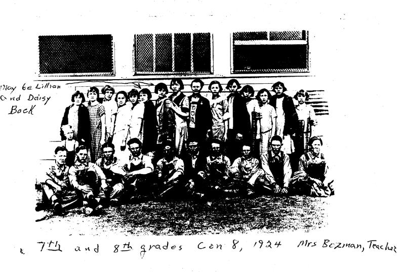 Pictures or any other information before 1930 are scarce. In early editions of this web page, I had a single picture of a Con. 8 class in the 1920’s courtesy of the family of Carl and Ruby Heien. Ruby had the picture because she was the teacher of the class. On the basis of indirect evidence, I had decided it was from the 1922 – 1923 school year. From the ages of the children (none of whom are identified) and information about the structure of the school in the era, I had judged the class to be the third, fourth, and fifth of that year. Jim and Nina Bauman have supplied three more pictures from that decade. One of these is labeled ” 7&8th Grades, 1924 “, and I assume to be from the end of the 1923 – 1924 school year. It is possible to see that the Heien picture and that Bock picture were both taken on the same day as well as the same place. Both show the windows on the north side of the building and the same windows are opened or closed to exactly the same degree. So the picture with Ruby Heien is no doubt from the 1923-1924 school year, and I think it may be just grades 5 and 6.