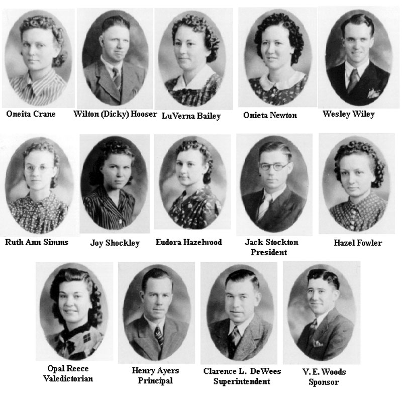 Class of 1940: Oneita Crane, Wilton (Dicky) Hooser, LuVerna Bailey, Onieta Newton, Wesley Wiley, Ruth Ann Simms, Joy Shockley, Eudora Hazelwood, Jack Stockton, Hazel Foyer, Opal Reece.