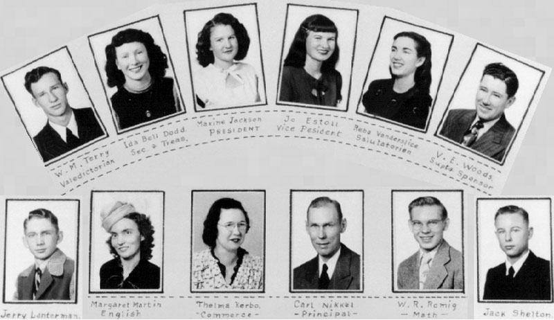 This year, the 8th grade was not a part of the high school. The graduation collage shows five teachers with the subjects indicated. Of these five it is likely that at least Thelma Kerbo and probably Margret Martin taught some in the grades using the team teaching concept.